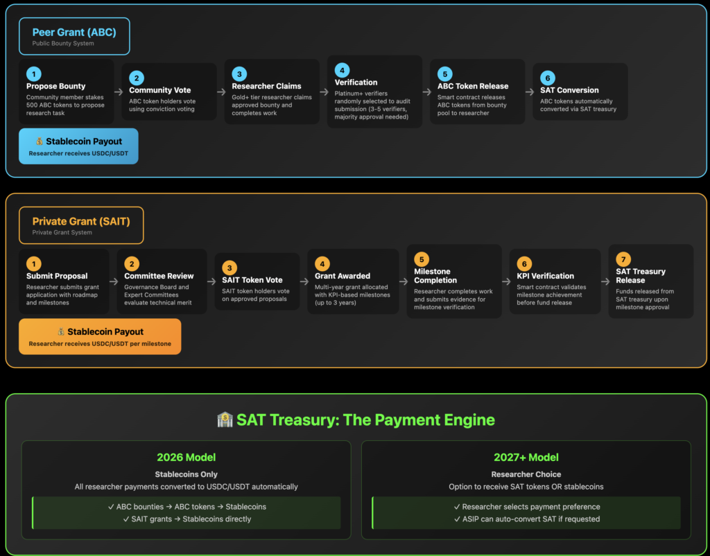 This tri-token model (ABC for public governance, SAIT for private governance, and SAT for treasury reserves) creates a fiscally responsible ecosystem where AI safety research can operate with the patient capital it requires while maintaining regulatory compliance and market confidence.